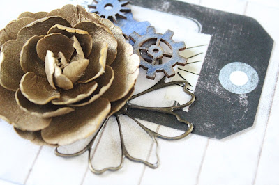 Within my layers on my cards I used the same 4 elements, a tag from the collection, a Prima flower, Finnabair by Prima wood veneer cog and gears and a metal flower. I wanted to add a bit of colour to the colours. As I am sure you all know the colours in this collection don't in to me so I got out my Tim Holtz Distress Ink in the colour Lilac. I than coloured the wooden gears and cogs with the distress ink as well as going around the outside of the card.